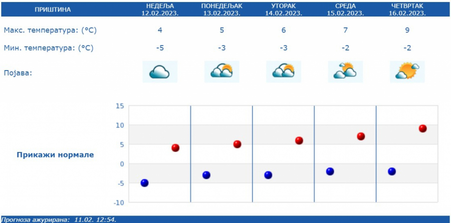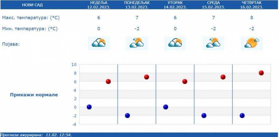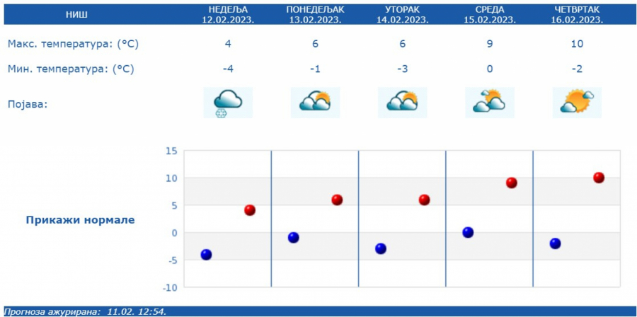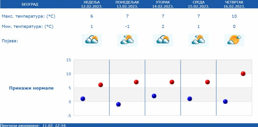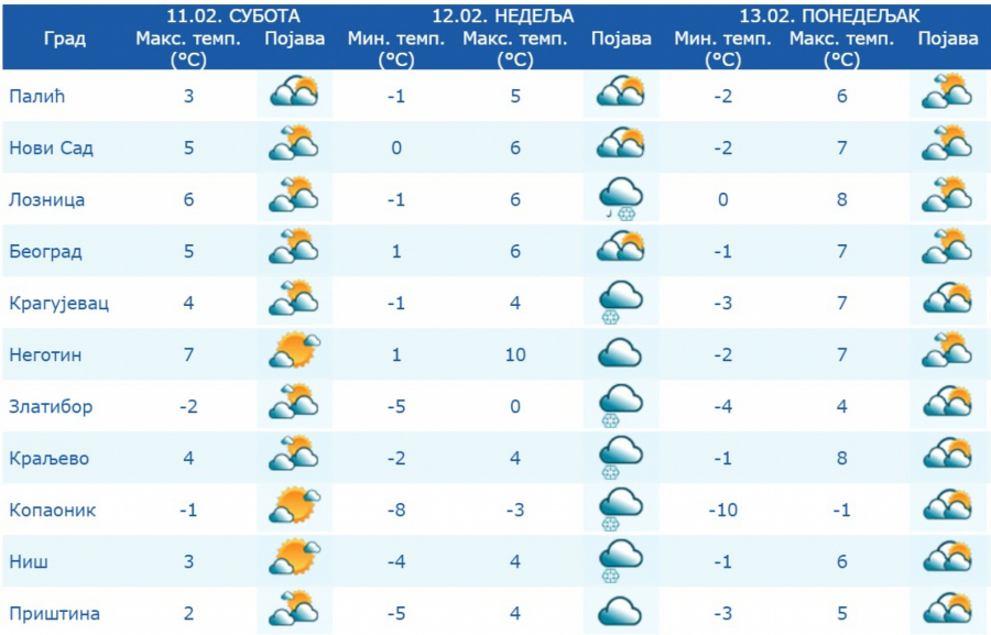 Najniža temperatura od -6 do 1 stepena, najviša dnevna od 3 stepena na jugoistoku do 10 stepeni na istoku Srbije.