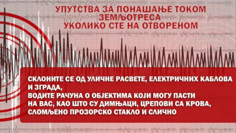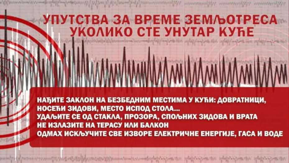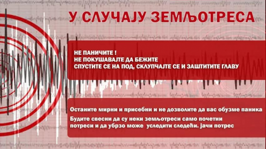 - Ostanite mirni i prisebni i ne dozvolite da vas obuzme panika. Budite svesni da su neki zemljotresi samo početni potresi i da ubrzo može uslediti sledeći, jači potres - navedno je iz Sektora i istaknuto sledeće, primenljivo u svim situacijama.