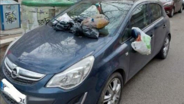 Naime, kako se automobil našao pored kontejnera, komšije su ga zatrpale punim kesama smeća. Džakovi su stajali na haubi, a jedna kesa visila je na retrovizoru.