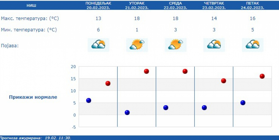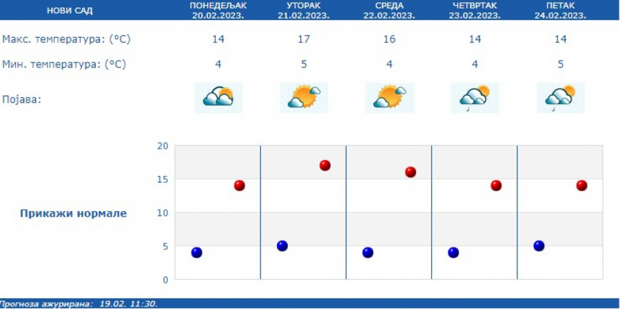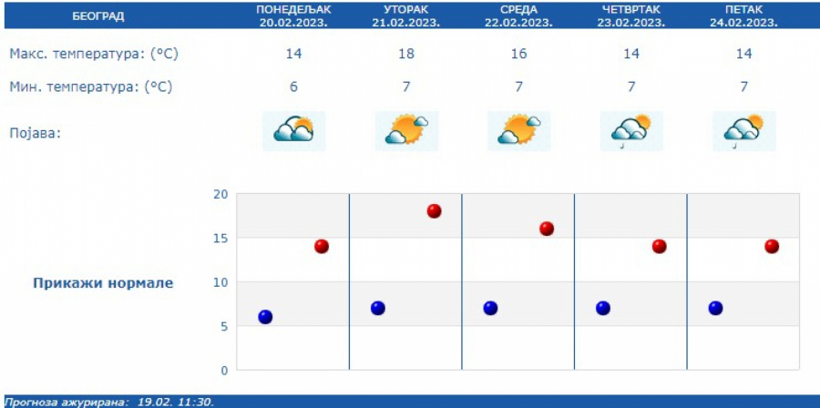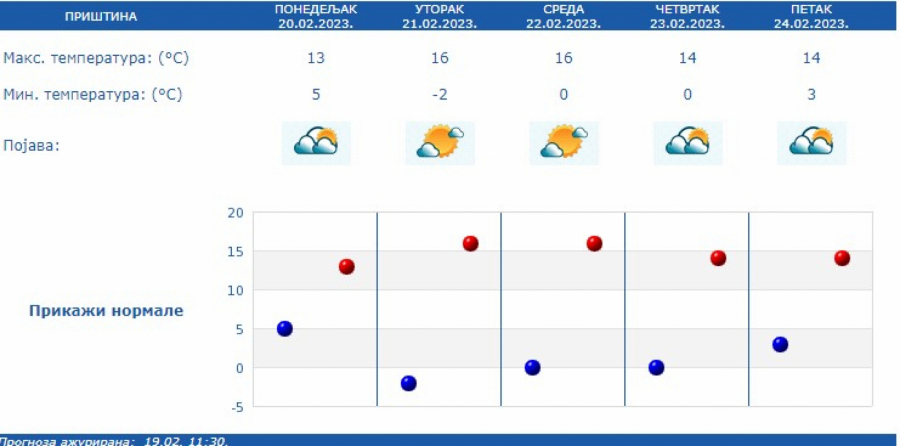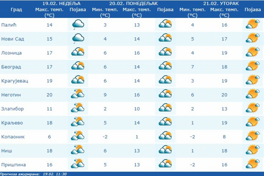 Najniža temperatura od 3 do 9, najviša od 12 do 16 stepeni. Vetar slab i umeren, na istoku jak severozapadni, posle podne u skretanju na zapadni i jugozapadni, saopštio je RHMZ.