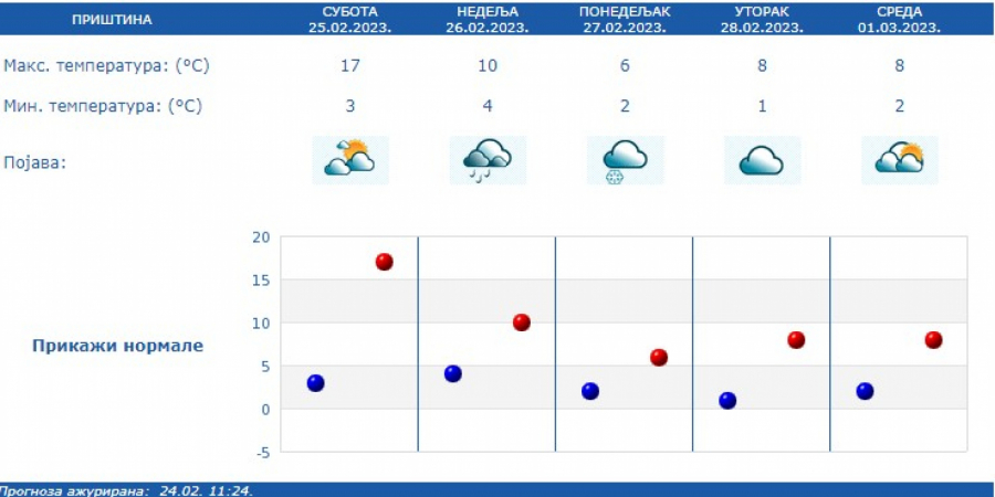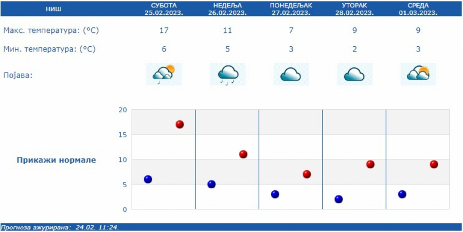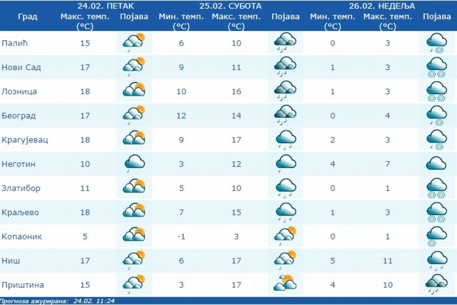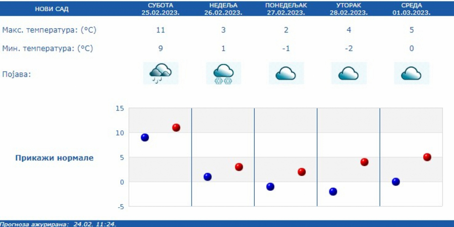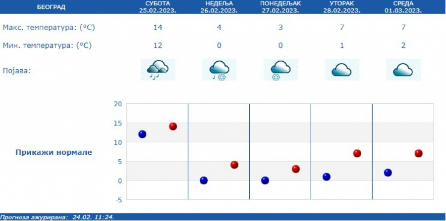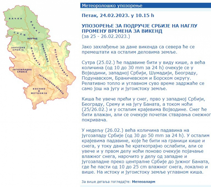 Kiša će uveče preći u sneg, prvo u zapadnoj Srbiji, Beogradu, Sremu i na jugu Banata, a tokom noći (25/26.02.) i u ostalim krajevima Vojvodine. Sneg će biti vlažan, ali se očekuje početak stvaranja snežnog pokrivača. Duvaće umeren i jak jugozapadni vetar, koji će u tokom dana biti u skretanju na severozapadni.
