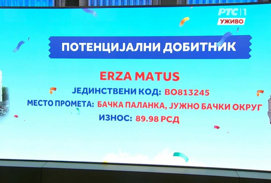 Trosoban stan na Novom Beogradu u naselju "Petica" dobila je Erza Matus, za račun iz Bačke Palanke u iznosu od 89,98 dinara.
