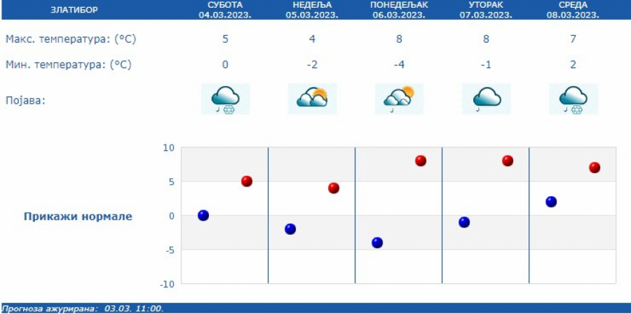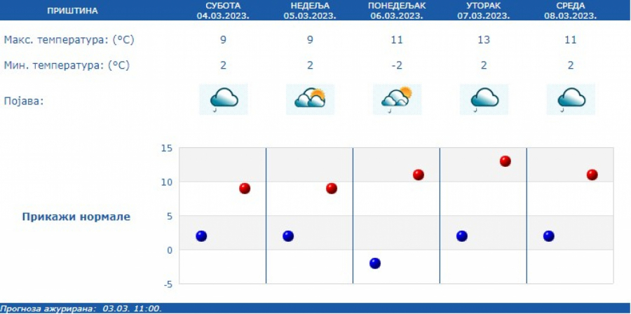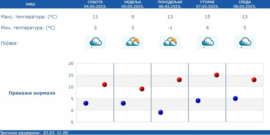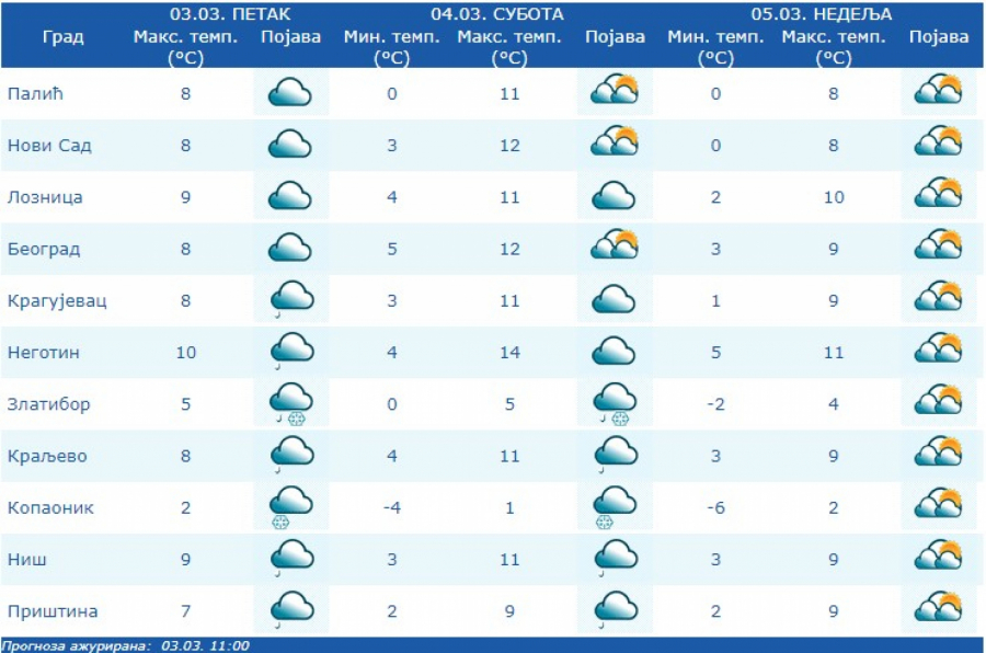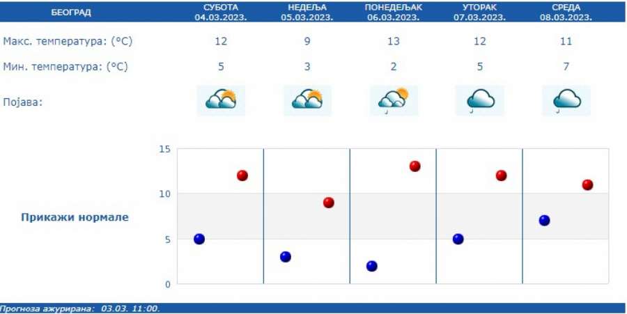 Najniža temperatura oko 5 °C, a najviša oko 12 °C. Prema prognozi za narednih sedam dana, u Srbiji će preovlađivati promenljivo vreme.