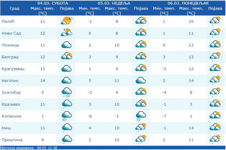 Vetar slab i umeren, na istoku Srbije jak, severozapadni, uveče u slabljenju. Najniža temperatura od -1 do 5 °C, a najviša od 7 do 11 °C.