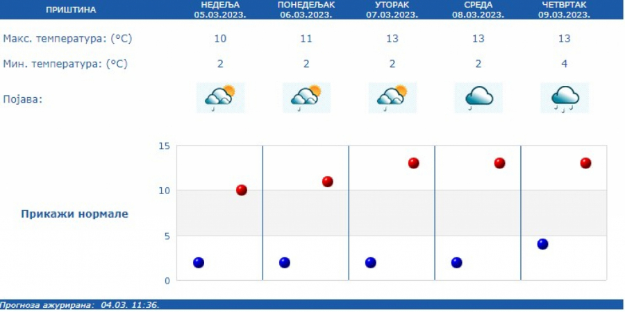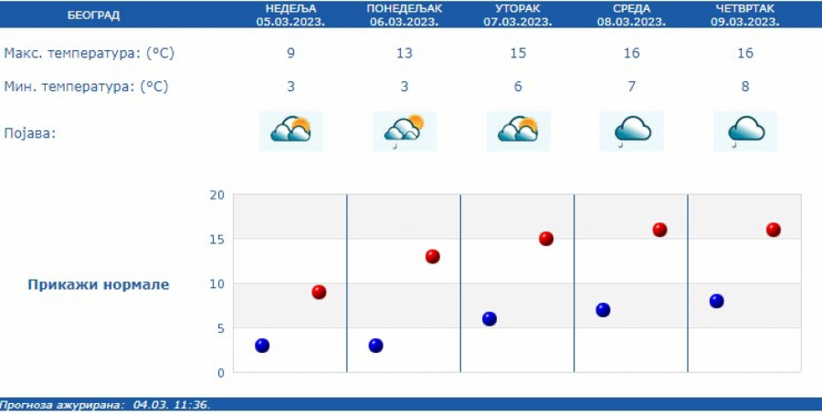 Prema prognozi za narednih sedam dana, u Srbiji se očekuje promenljivo vreme, uz smenu sunčanih i oblačnih intervala - kratkotrajna kiša ili pljusak u prvom delu naredne nedelje biće lokalna pojava, dok se više padavina očekuje krajem sedmice.