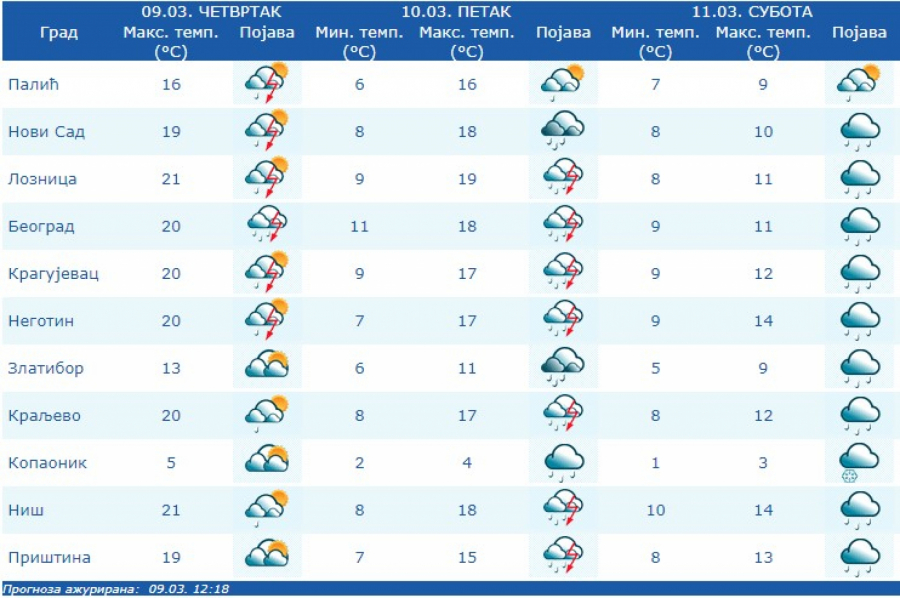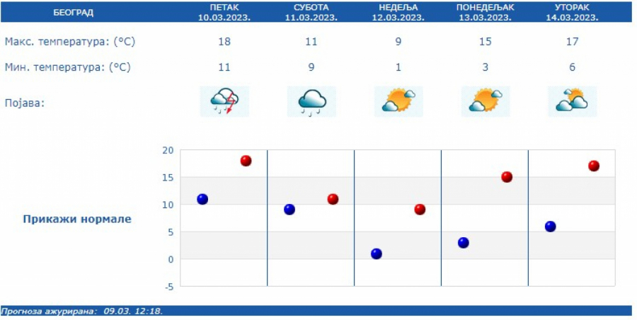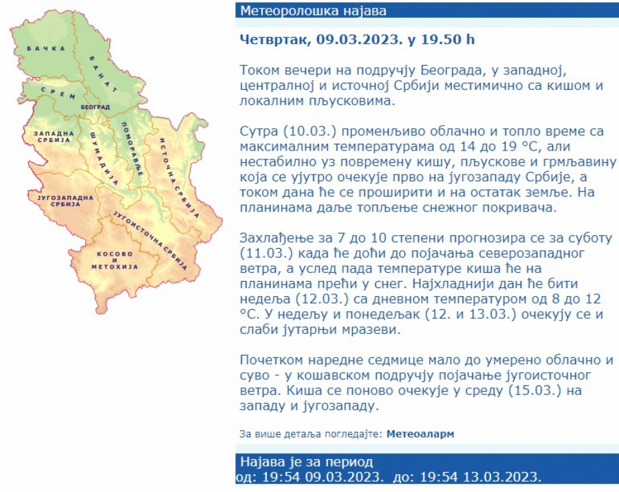 U nedelju i ponedeljak ujutru slab mraz, tokom dana pretežno sunčano. Od utorka do petka, 17. marta, malo i umereno oblačno i suvo, samo u sredu na zapadu i jugozapadu ponegde slaba kiša, na visokim planinama provejavanje snega.