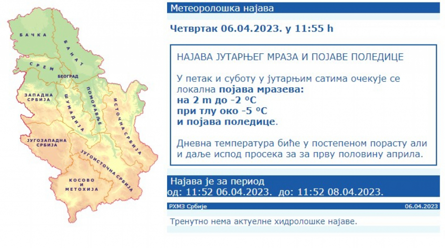 U Srbiji u subotu na jugu u jutarnjim satima slab mraz na 2 metra visine, dok se pri tlu slab mraz očekuje u većini krajeva do -5 stepeni.