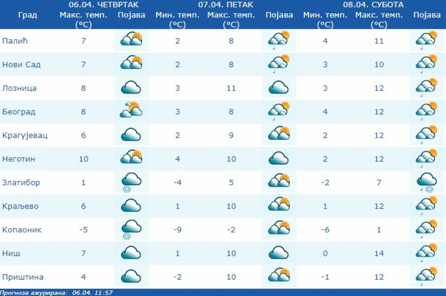 U Beogradu umereno do potpuno oblačno, pre podne sa slabom kratkotrajnom kišom. Jutarnja temperatura od 1 do 3, najviša dnevna oko 8 stepeni. Vetar slab i umeren, zapadni i severozapadni, krajem dana u skretanju na jugoistočni.