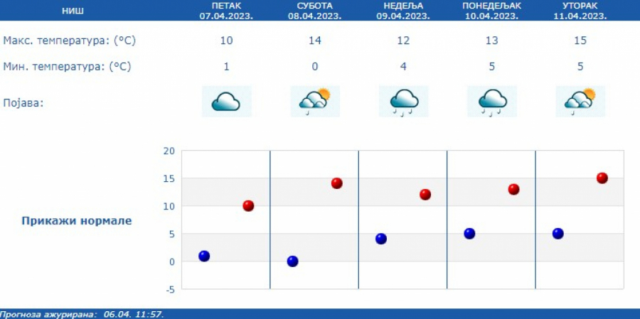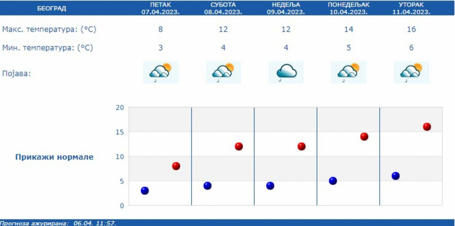 Od nedelje temperatura u porastu. Dnevna temperatura biće u postepenom porastu, za dane vikenda ispod, a od ponedeljka, 11. aprila, do petka 14. aprila, u granicama proseka za prvu polovinu aprila.