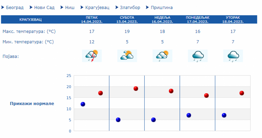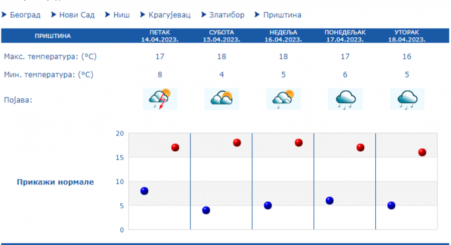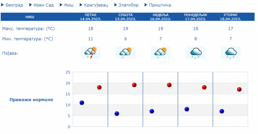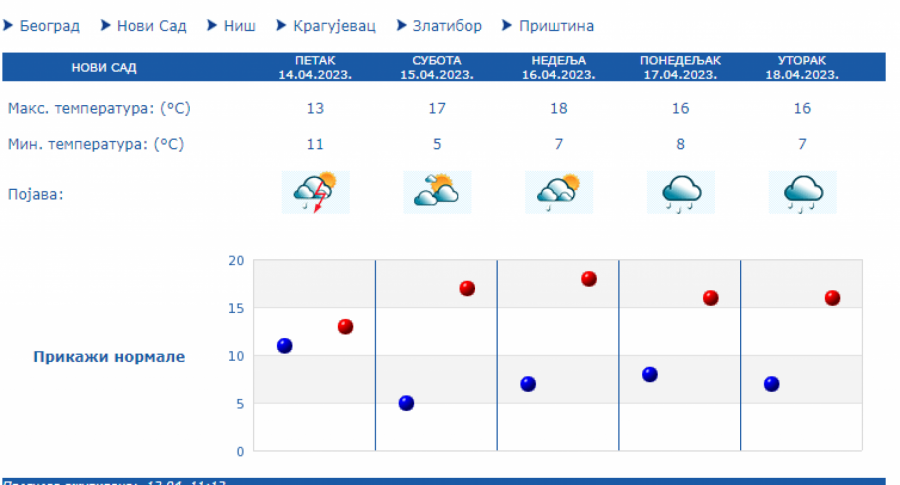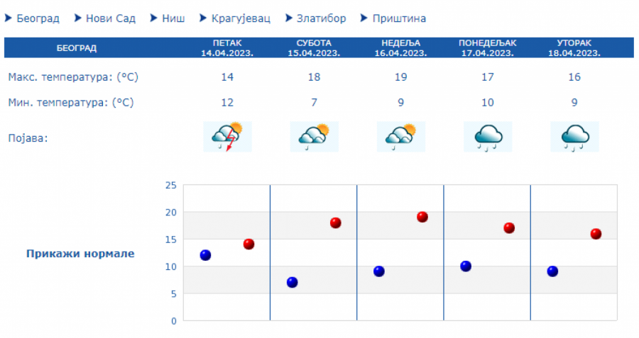 Tokom dana će uz obačno i kišovite vreme na severu zemlje biti hladnije sa maksimalnom temperaturom oko 14 stepeni, dok na jugu se očekuje malo toplije sa temeperaturam do 17 stepeni.