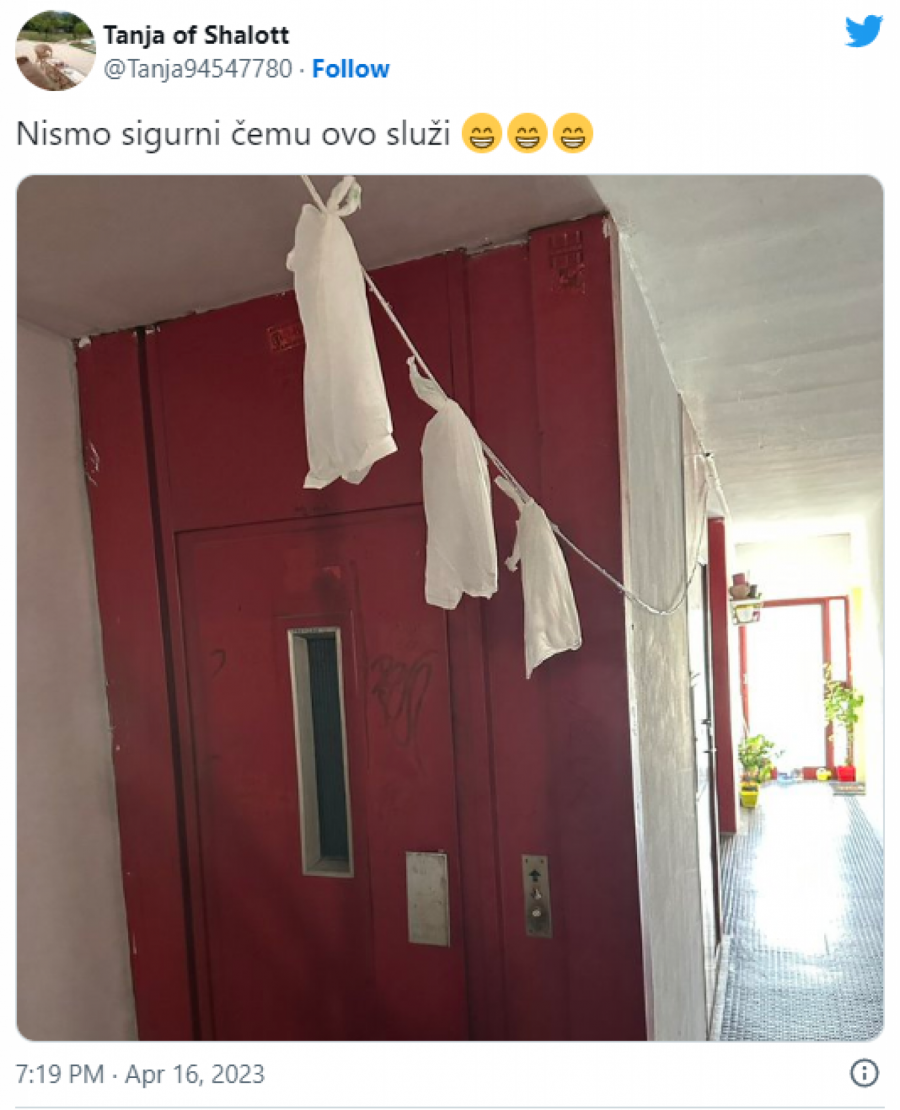 - Nismo sigurni čemu ovo služi - piše u objavi uz fotografiju na kojoj se vidi lift u zgradi, a ispred lifta kabl na kome su okačene kese.