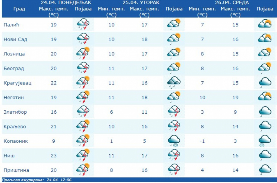 Stiže i hladniji vazduh iz srednje Evrope, pa će uveče na visokim planinama kiša preći u sneg. Jutarnja temperatura od 6 do 12 stepeni, najviša dnevna od 15 do 19 stepeni.