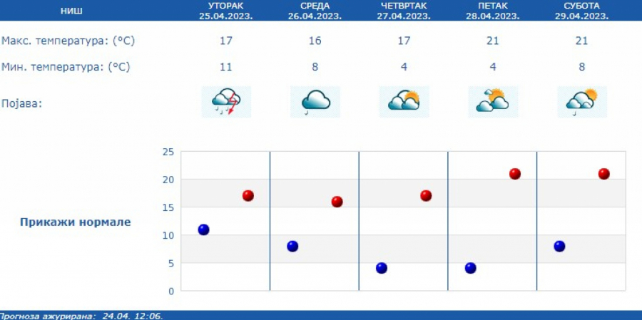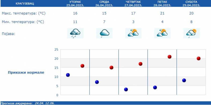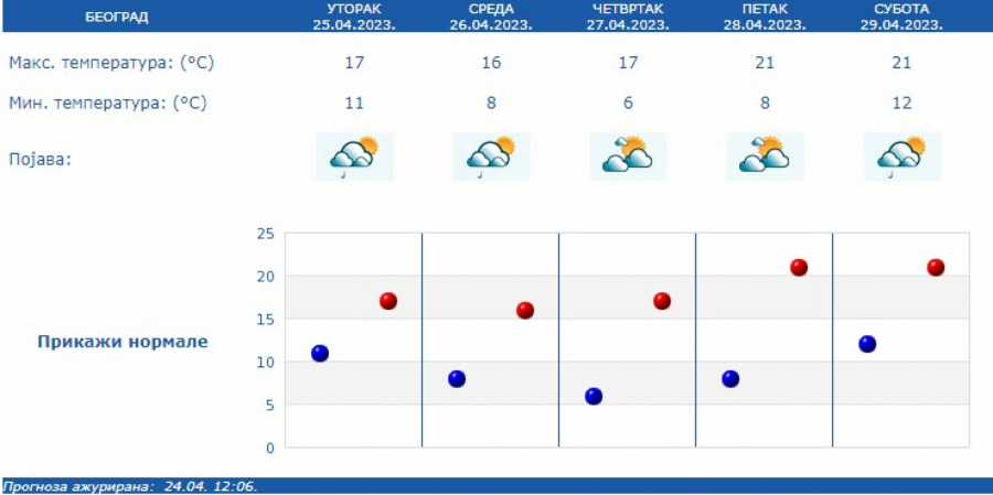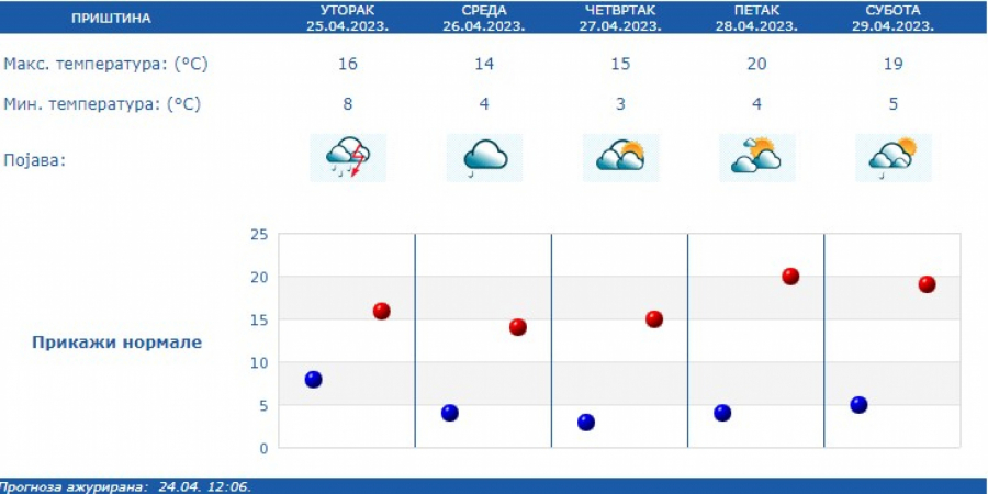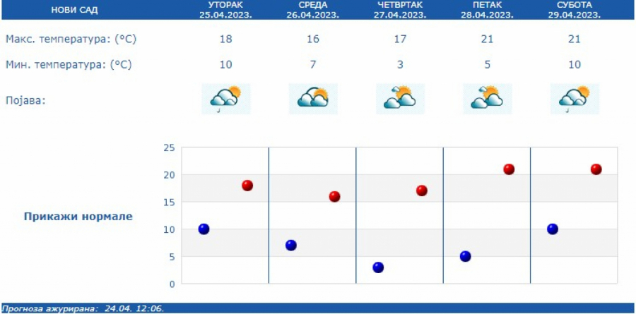 Umereno do potpuno oblačno i vetrovito, mestimično s kišom, ponegde i kratkotrajnim pljuskovima. Na visokim planinama sneg. Vetar umeren i jak, severni i severozapadni. Uveče prestanak padavina, zatim i razvedravanje, a vetar će biti u slabljenju. Najniža temperatura od 4 do 10, najviša dnevna od 14 do 19 stepeni.