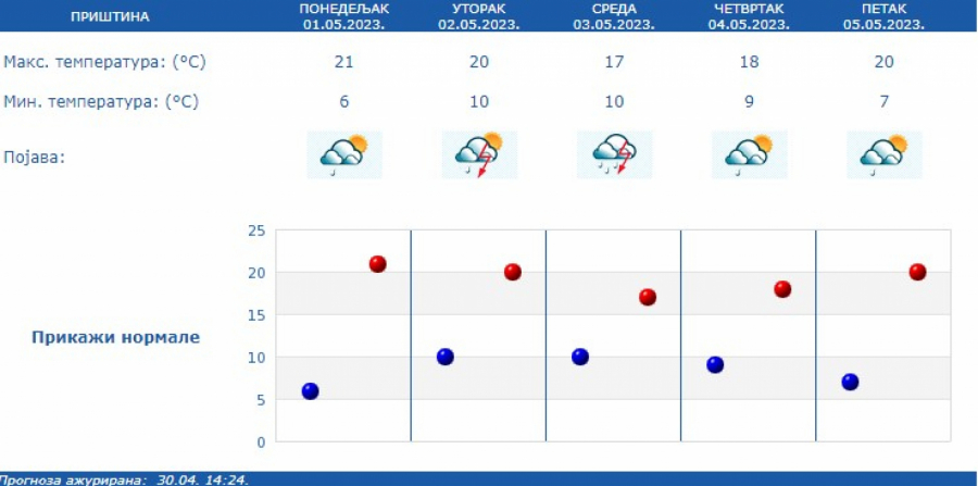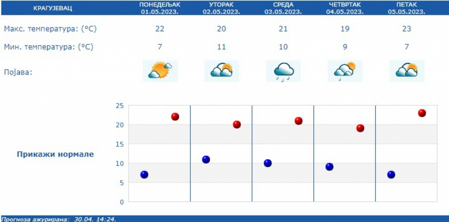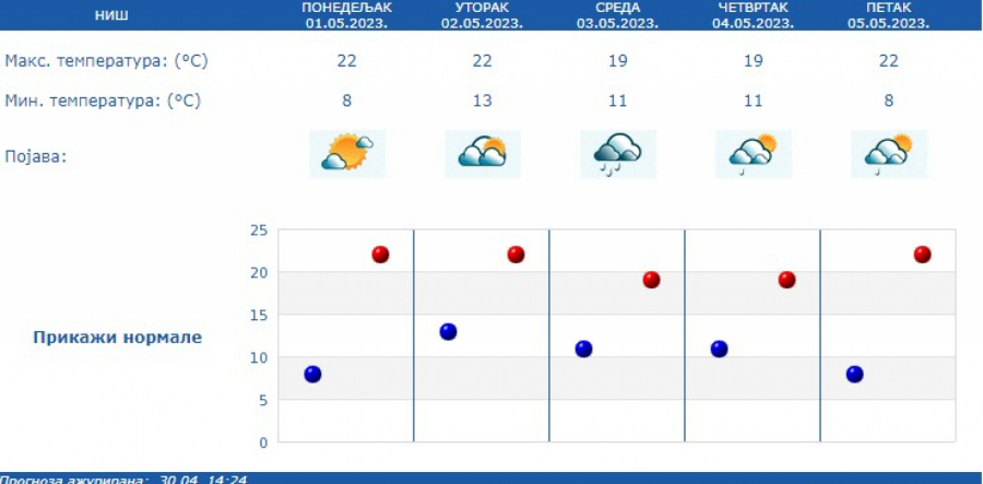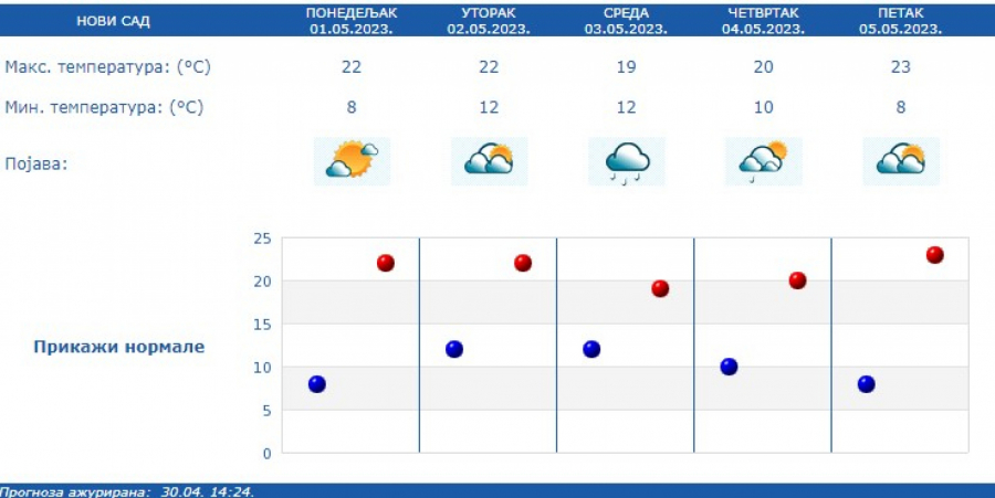 U Srbiji danas pretežno sunčano i toplo, posle podne u planinskim krajevima, uz lokalni razvoj oblačnosti, pljuskovi sa grmljavinom. Najniža temperatura od 5 do 10, najviša od 20 do 23 stepena.