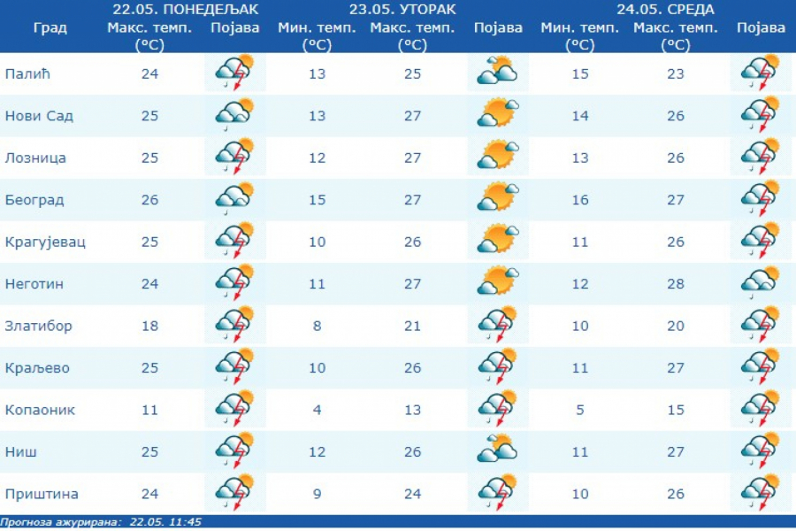 „U naredna dva sata na severu Vojvodine, jugu Banata i severu Braničevskog okruga, kao i ponegde u brdsko-planinskim predelima zapadne i južne Srbije, kiša i lokalni pljuskovi s grmljavinom. U pojedinim delovima Beograda kratkotrajna kiša ili pljusak s grmljavinom“, objavio je upravo RHMZ.