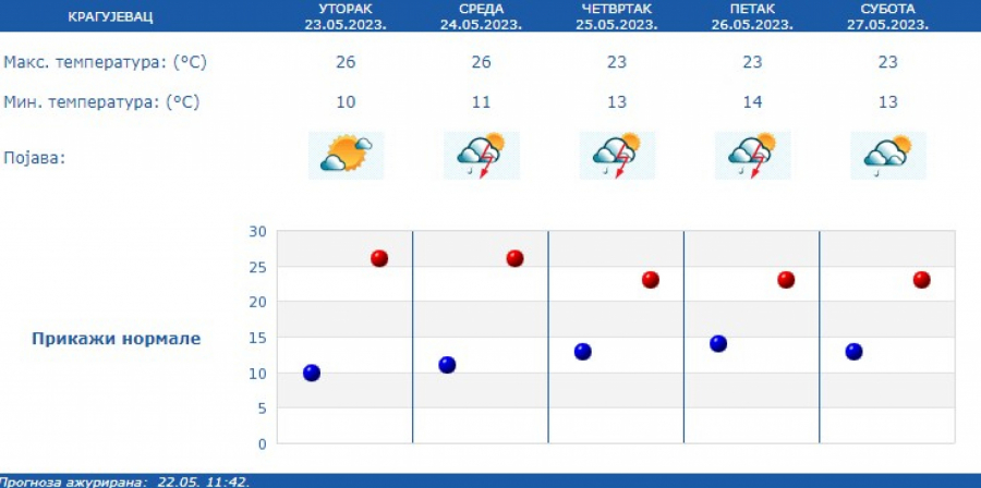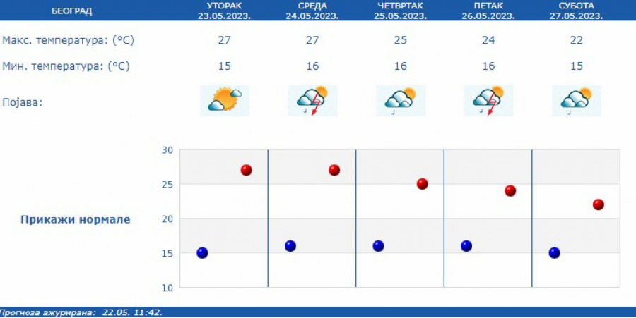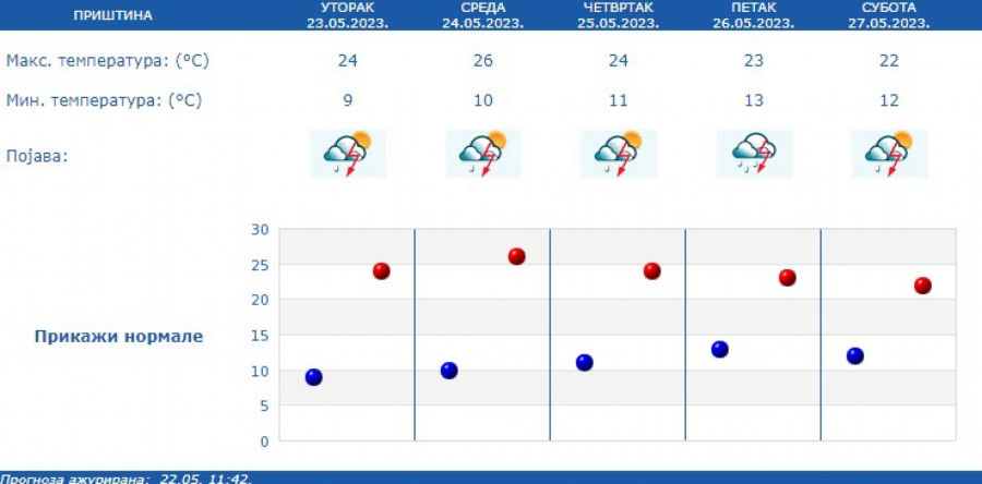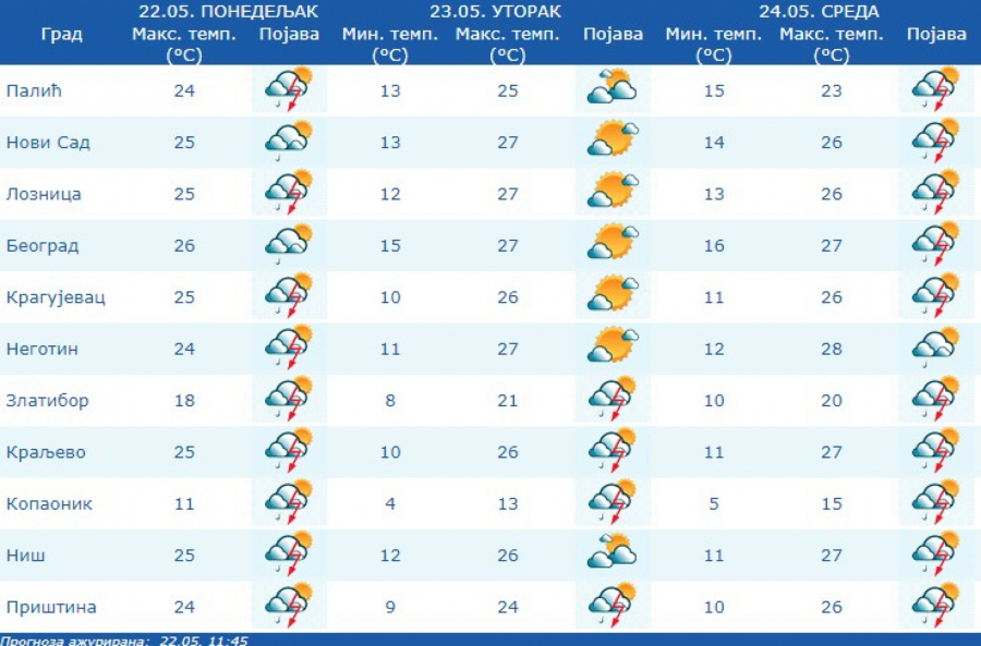 Od sredine dana, uz dnevni razvoj oblačnosti, moguća je ređa pojava kratkotrajne kiše ili pljuskova s grmljavinom uglavnom u brdsko-planinskim predelima, a uveče i tokom noći na severu zemlje.