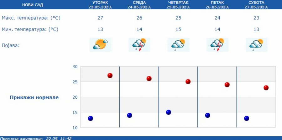 U narednih sedam dana očekuje se promenljivo, toplo i nestabilno, u većini krajeva s kišom i pljuskovima sa grmljavinom, koji će lokalno biti izraženiji, prenosi Tanjug.