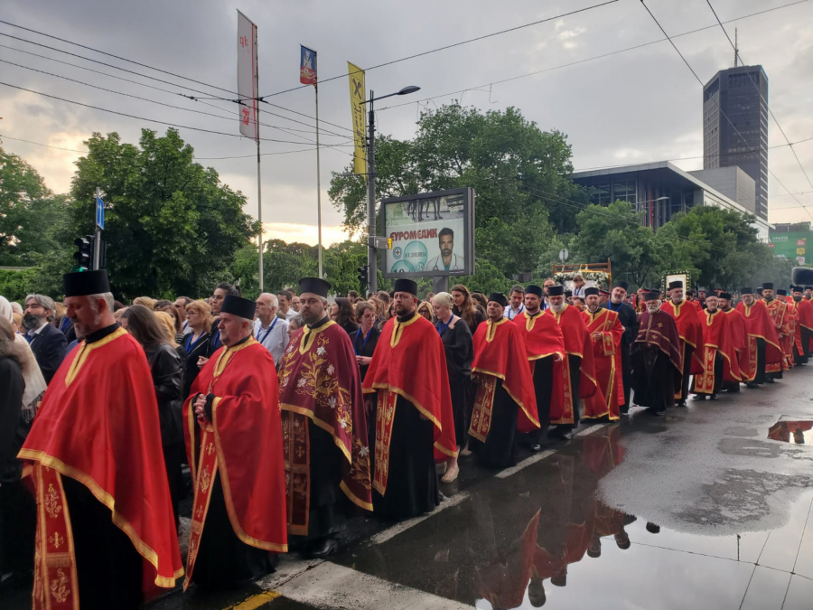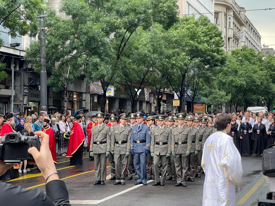 Uz patrijarha Porfirija i crkvene velikodostojnike na čelu litije, pored moštiju Svetog vladike Nikolaja Velimirovića, se nalaze i gradonačelnik Aleksandar Šapić, ministri Miloš Vučević i Nikola Selaković, gradski menadžer Miroslav Čučković, košarkaš Dejan Tomašević, i mnogi drugi.