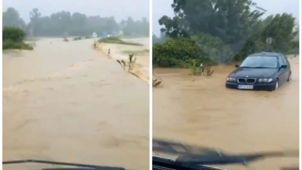 Vidi se nabujala voda, a put kojim on ide uopšte se ne vidi. Na snimku se vidi i da neki vozači automobila pokušavaju da prođu tuda, ali se zaglavljuju na polovini jer je voda duboka.