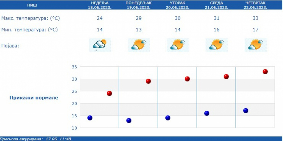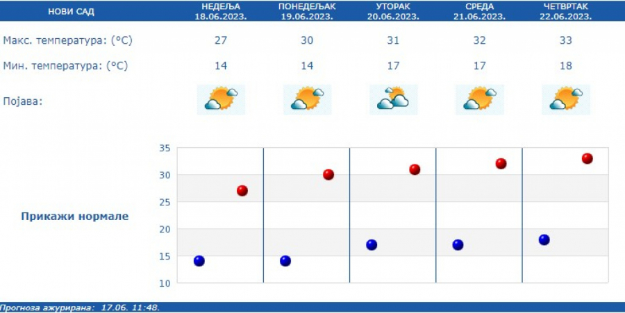Pretežno sunčano i veoma toplo. Vetar slab i umeren, jugoistočni, od sredine dana u skretanju na severozapadni. Najniža temperatura od 14 do 20 stepeni, a najviša od 29 do 34 stepena.