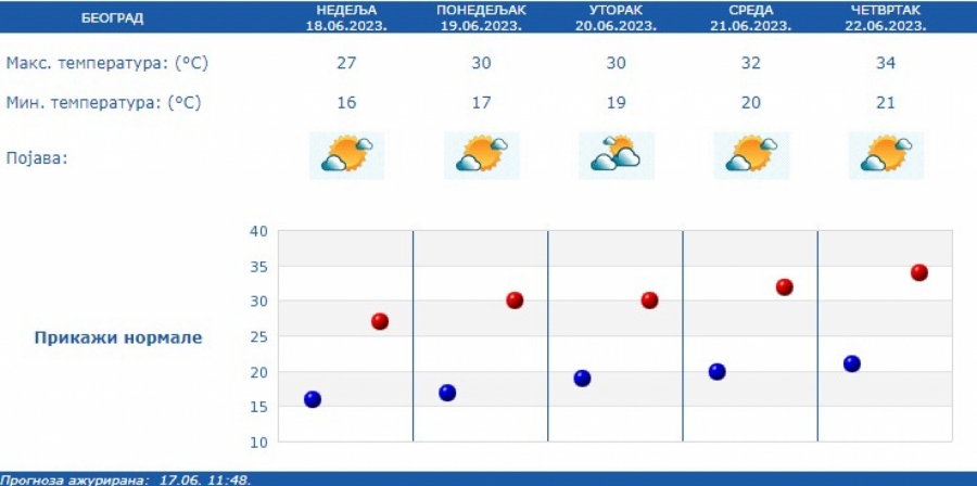 Najniža temperatura od 13 do 17 stepeni, najviša od 23 do 27 stepeni.