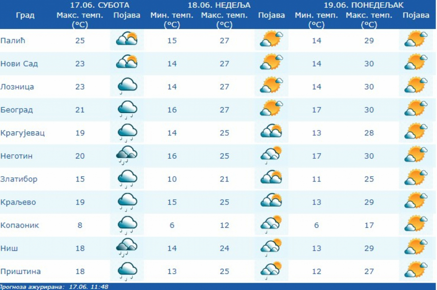 Pretežno sunčano i toplo. Uz lokalni razvoj oblačnosti očekuje se pojava pljuskova sa grmljavinom. Vetar slab i umeren, istočni i jugoistočni. Najniža temperatura od 12 do 19 stepeni, a najviša od 28 do 31 stepen.