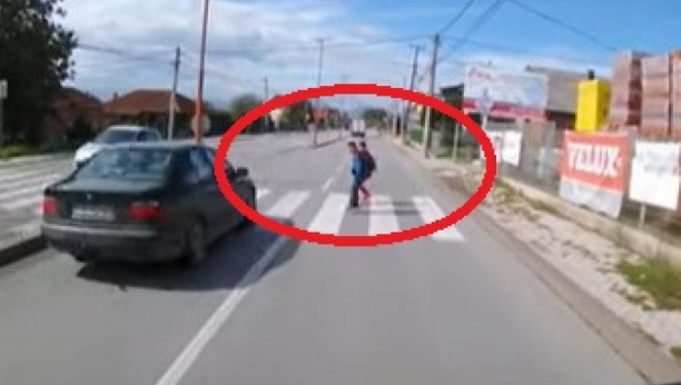 Na snimku se vide dečak i devojčica koji su prelazili ulicu, kada ih je umalo pokosio bahati vozač.