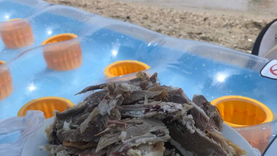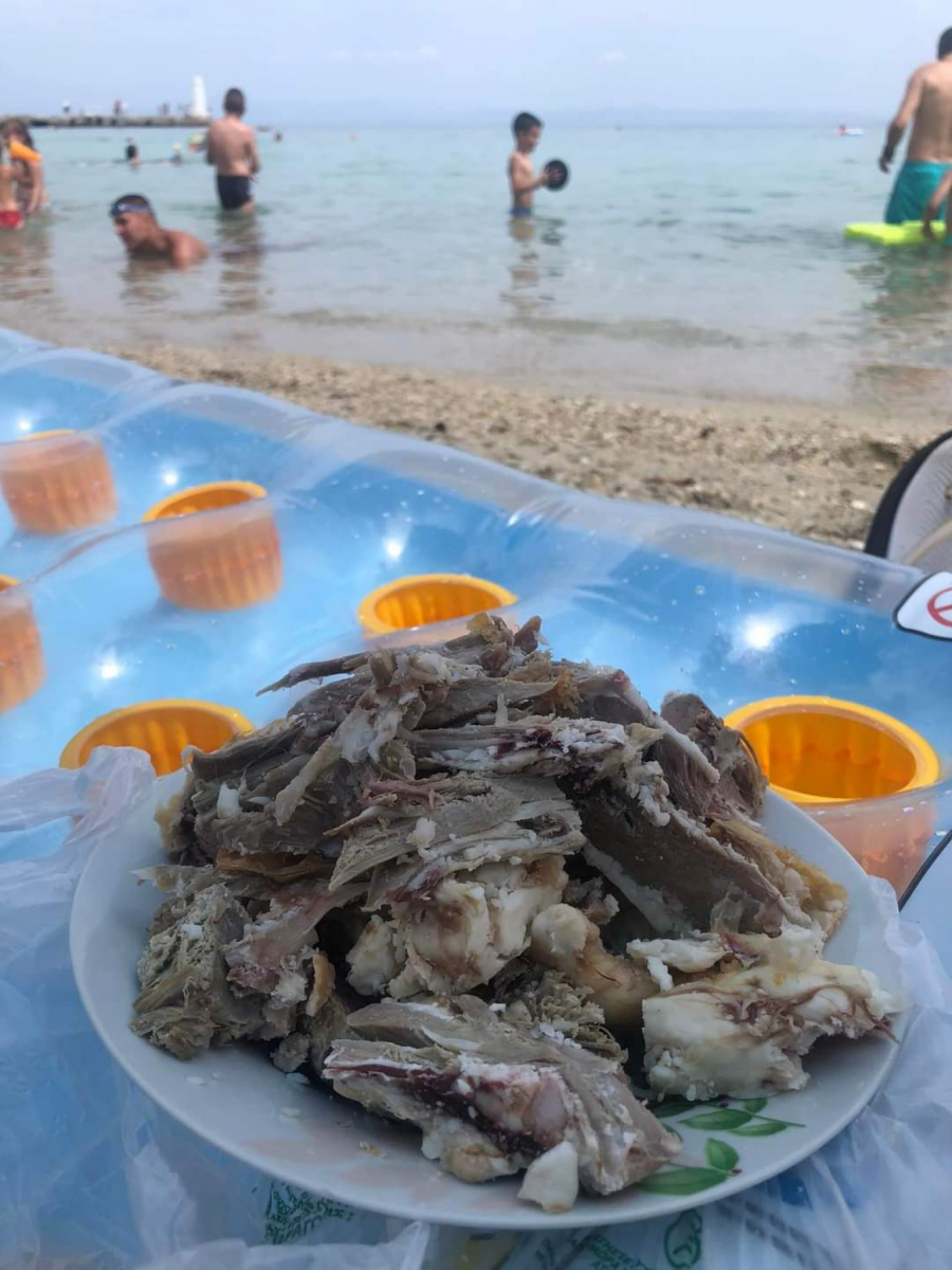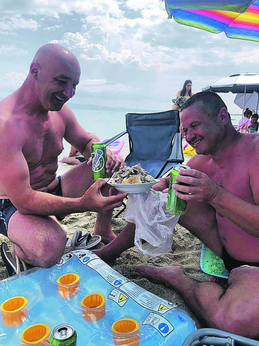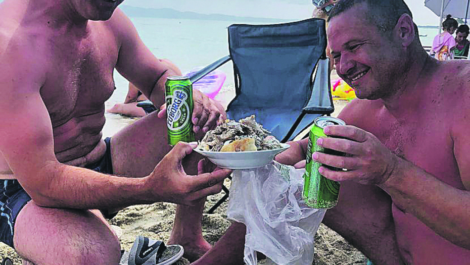- Moj prijatelj i ja smo razmišljali šta ćemo jesti na odmoru pošto nismo ljubitelji morskih plodova i girosa, ne volimo lignje, dagnje, pa smo se odlučili da ponesemo jagnje! - objasnio nam je Aleksandar i dodao da su on i njegova supruga Daca, kao i drugar Goran i njegova supruga Marija, uz pečenje poneli i domaću rakijicu iz Kuršumlije.