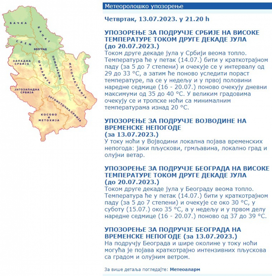 Temperatura će u petak (14.07.) biti u kratkotrajnom padu (za 5 do 7 stepeni) i očekuje se u intervalu od 29 do 33 °C, a zatim će ponovo uslediti porast temperature, pa se u nedelju i u prvoj polovini naredne sedmice (16 - 20.07.) ponovo očekuju dnevni maksimumi od 35 do 40 °C. U velikim gradovima očekuju se i tropske noći sa minimalnim temperaturama iznad 20 °C.