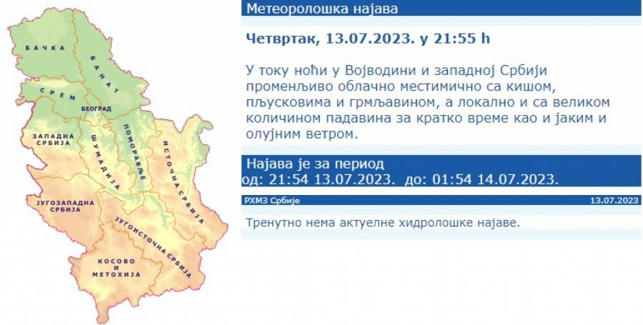 U toku noći u Vojvodini i zapadnoj Srbiji promenljivo oblačno mestimično sa kišom, pljuskovima i grmljavinom, a lokalno i sa velikom količinom padavina za kratko vreme kao i jakim i olujnim vetrom, stoji u novom upozorenju RHMZ.