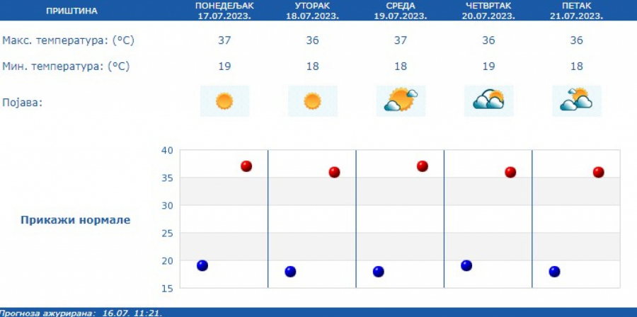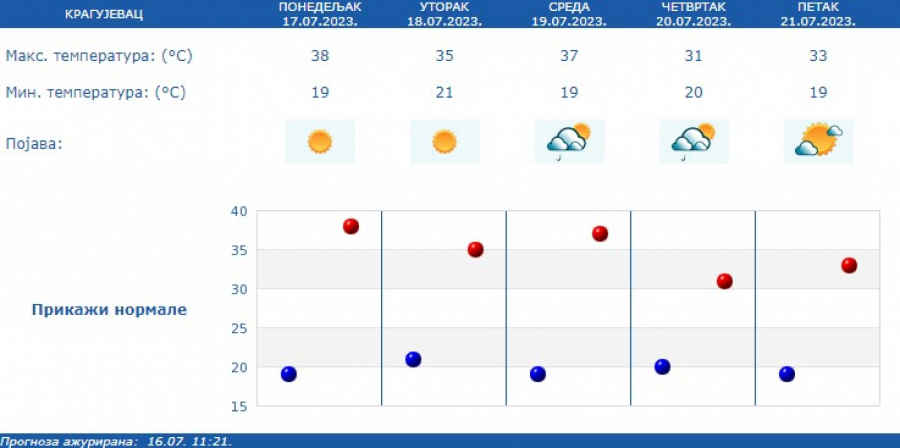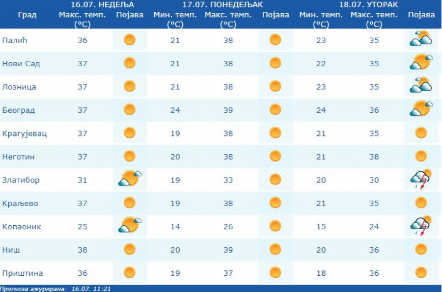 U Srbiji u utorak i sredu veoma toplo i u većini mesta pretežno sunčano. Uz lokalni razvoj oblačnosti u utorak je u brdsko-planinskim predelima moguć kratkotrajni pljusak s grmljavinom.