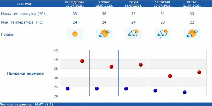 I u Beogradu sunčano i veoma toplo. Najniža temperatura od 21 do 24, a najviša oko 39 stepeni. Vetar slab, zapadni.