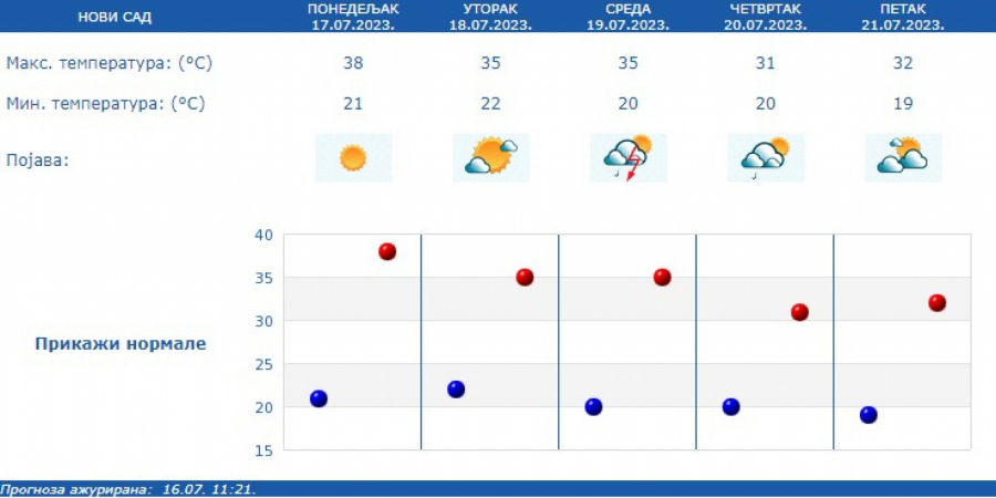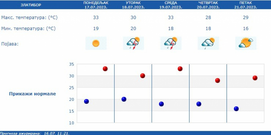 U sredu posle podne, a naročito uveče i tokom noći, u severnoj i delu zapadne i centralne Srbije promenljivo s kišom, pljuskovima i grmljavinom, koji ponegde mogu biti izraženiji, a postojaće i uslovi za nepogode: grad i jak i olujni vetar.