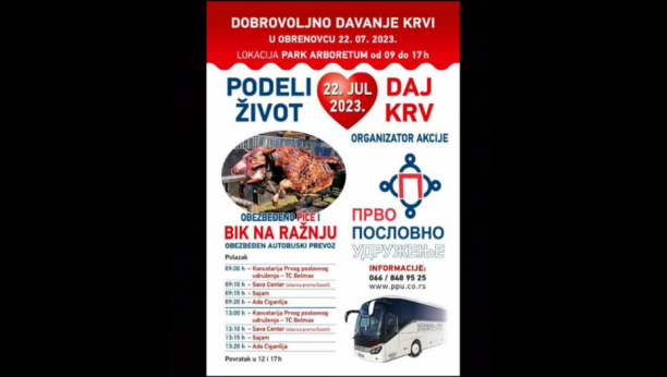 Udruženje privrednika. Prvo poslovno udruženje Beograd u saradnji sa svojim prijateljima g.o Obrenovac Institut za tranfuziju krvi-Zemun, Crveni krst Beograd i Crveni krst Obrenovac organizuje veliku humanitarnu akciju pod nazivom "PODELI ŽIVOT - DAJ КRV" koja će se održati 22 jula 2023. godine u Obrenovcu, park Arboretum sa početkom u 9 časova.