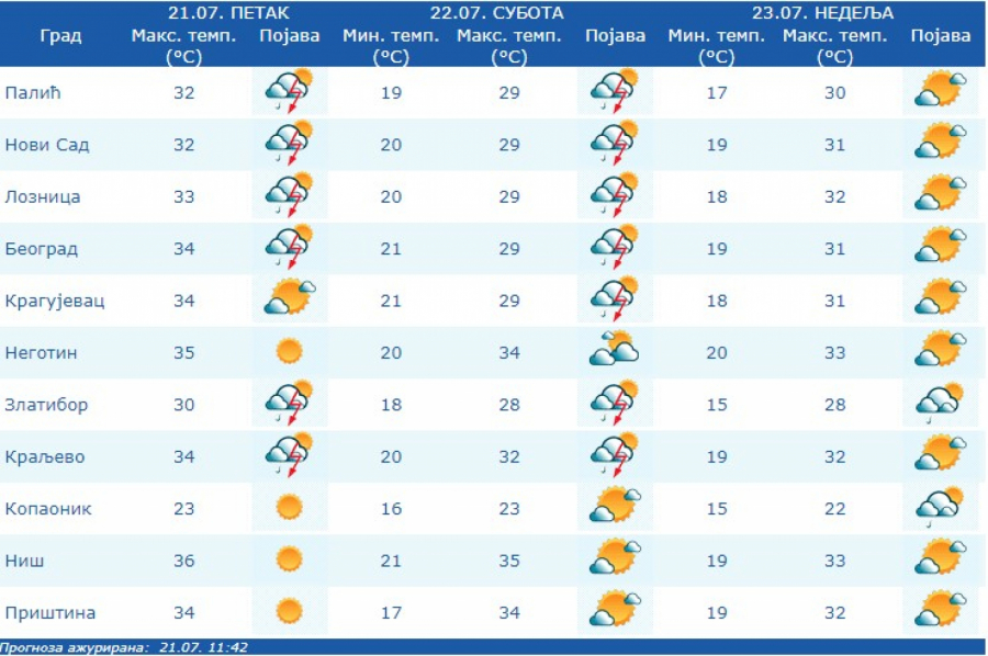 Kasno posle podne uveče i tokom noći očekuje se nestabilno vreme sa pljuskovima i grmljavinom, kao i uslovima za nepogode sa jakim i olujnim severozapadnim vetrom, ponegde i gradom. Temperatura će se kretati od 19 do 29 stepeni.
