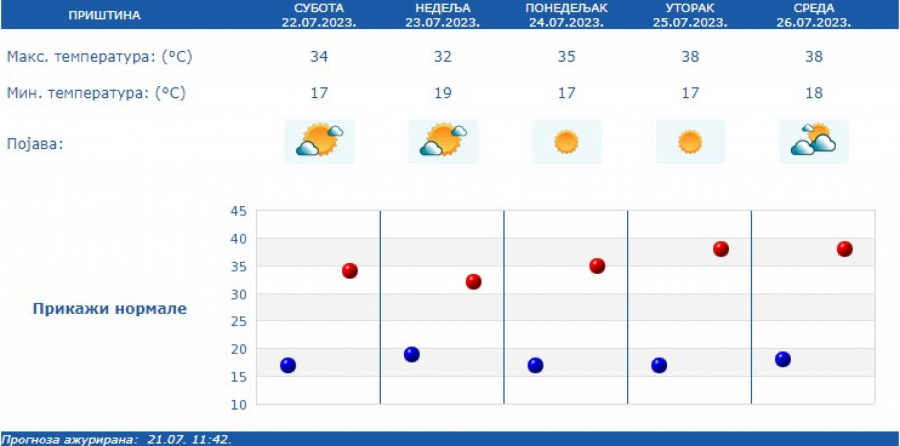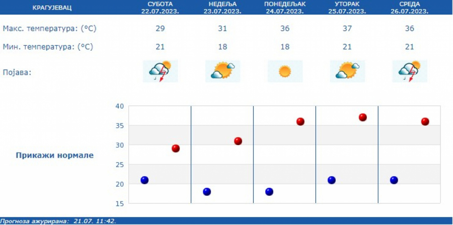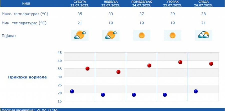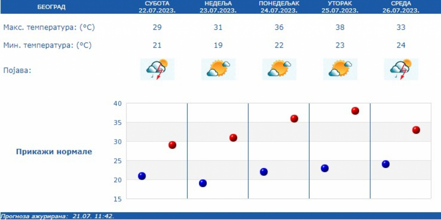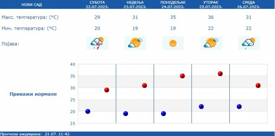 Nakon kratkotrajnog osveženja u nedelju, početkom sledeće sedmice ponovo će biti veoma toplo sa maksimalnim temperaturama i do 40 stepeni, u sredu posle podne i četvrtak promenljivo oblačno i nestabilno sa lokalnom pojavom kiše, pljuskova i grmljavina.