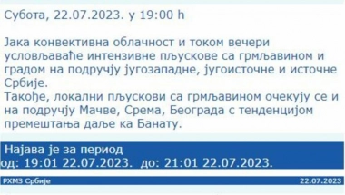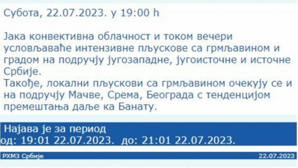 Kako je i najavio RHMZ, do glavnog grada je stigla "jaka konvektivna oblačnost" koja izaziva "intenzivne pljuskove sa grmljavinom i gradom".
