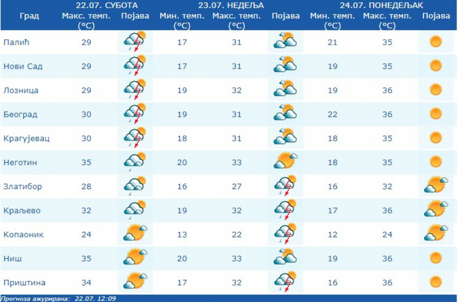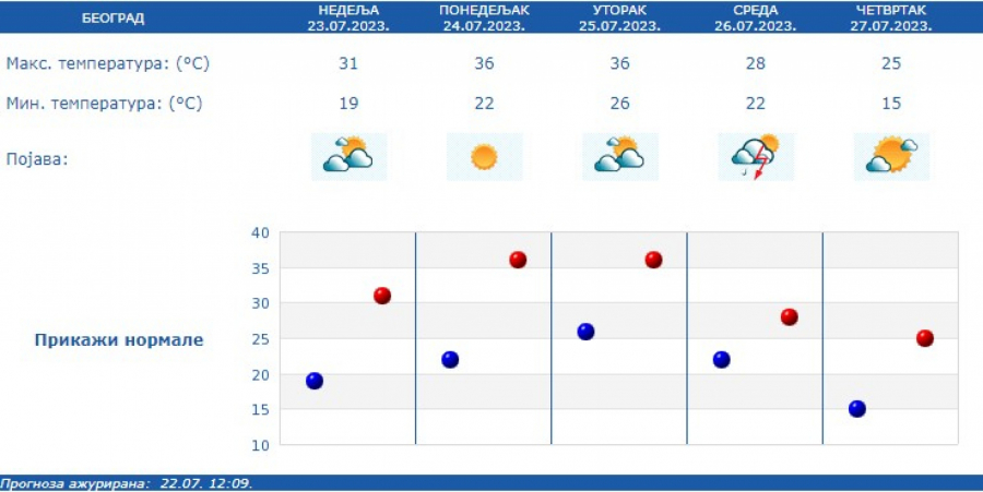 Prema izgledima vremena u narednih sedam dana, do 30. jula, u Srbiji se očekuje pretežno sunčano i veoma toplo vreme sa maksimalnom temperaturom od 33 do 40 stepeni.