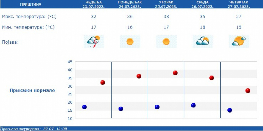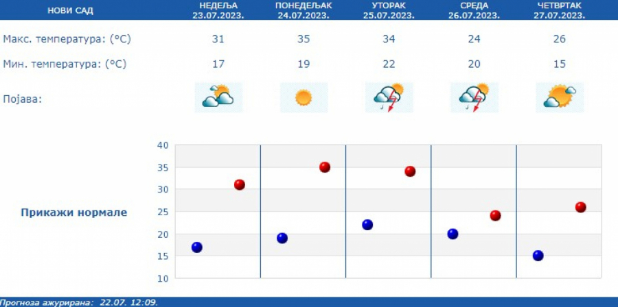 U utorak posle podne, u brdsko-planinskim predelima, ponegde se očekuju kratkotrajni pljuskovi s grmljavinom, dok se uveče na severu, a tokom noći u zapadnim i centralnim krajevima predviđa osetan pad temperature i nepogode u vidu intenzivnih pljuskova, jakog i olujnog vetra, kao i lokalne pojave grada.
