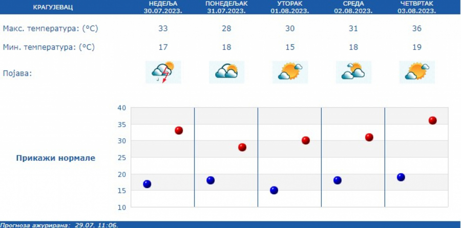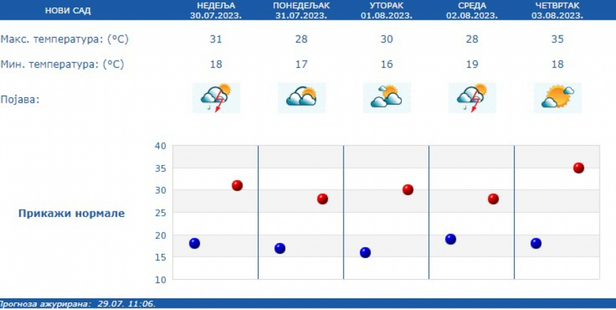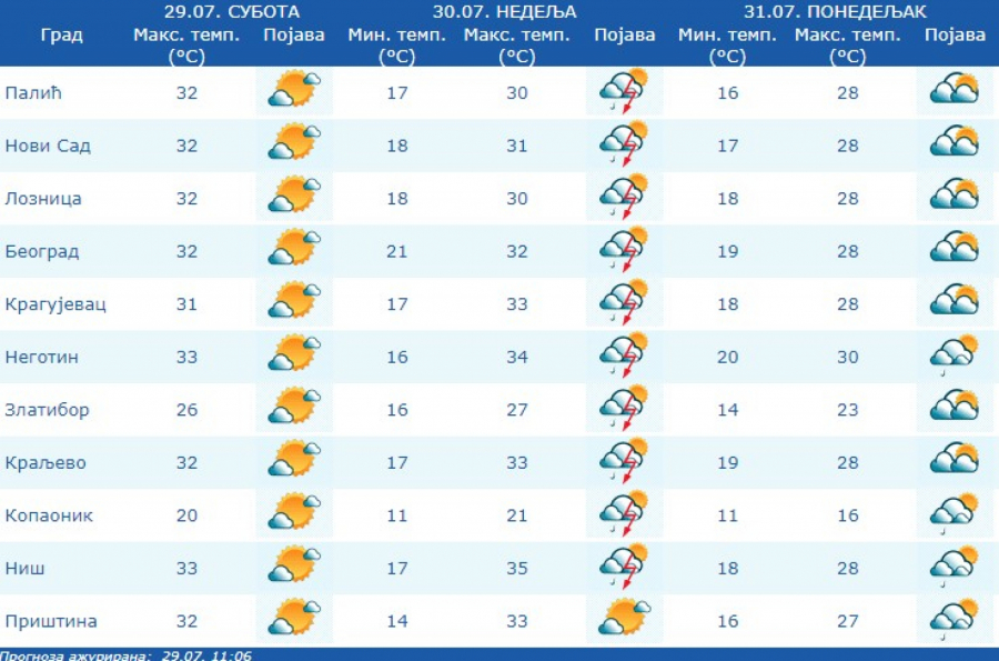 Nagli pad temperature za 10 do 15 stepeni praćen kišom, pljuskovima, grmljavinom i pojačanim vetrom koji se na severu i zapadu očekuje prvog dana vikenda, u toku noći ka nedelji i u nedelju (6. avgusta) tokom dana će se proširiti i na ostale krajeve.