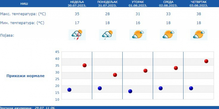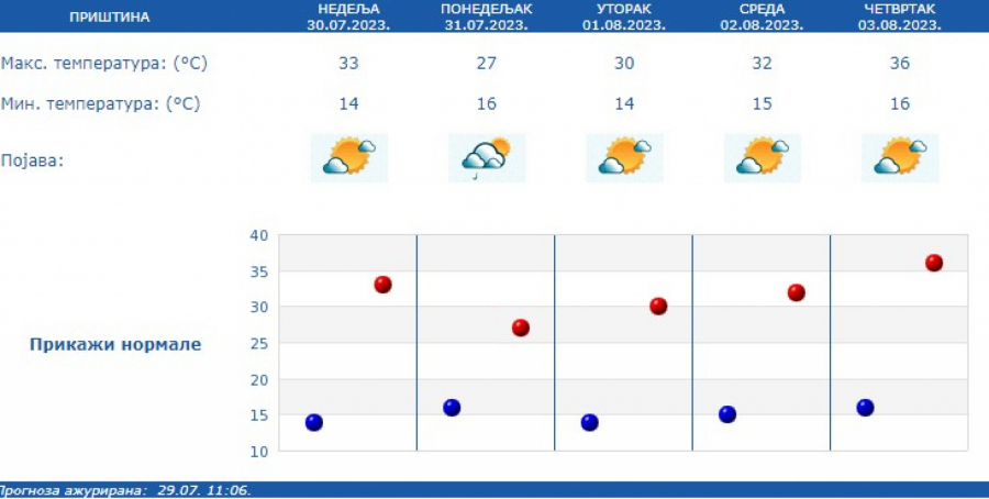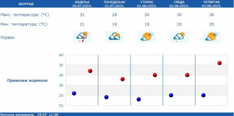 Od utorka sve toplije. Lokalna pojava pljuskova sa grmljavinom očekuje se samo u noći između utorka i srede, kao i u sredu tokom dana u Vojvodini, dok će najtoplije biti u četvrtak i petak u celoj zemlji, a u subotu još u južnim i istočnim krajevima, uz maksimalne temperature od 34 do 38 °C.