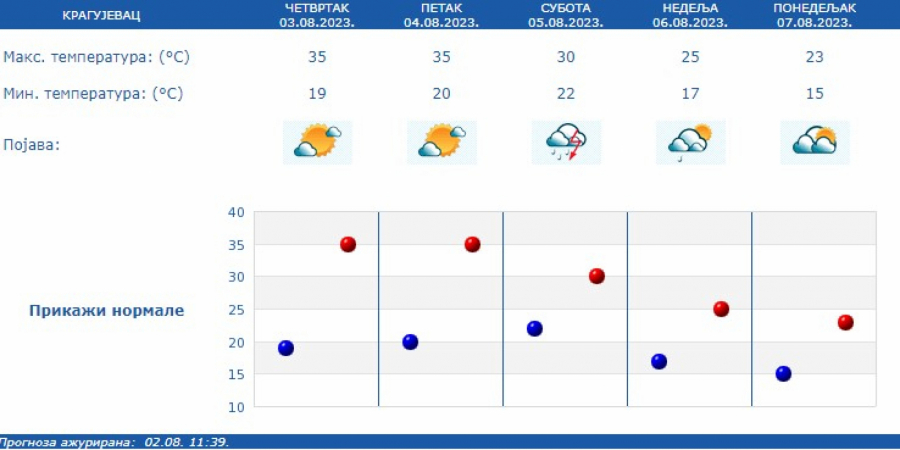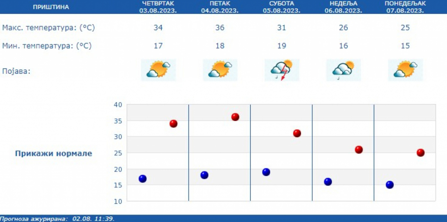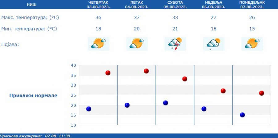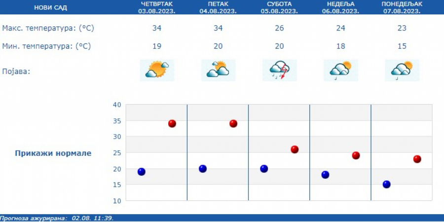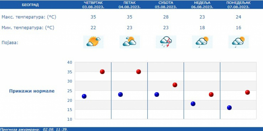 Za vikend se predviđa zahlađenje za 10 do 15 stepeni - u subotu u svim krajevima mestimično sa kišom, pljuskovima, grmljavinom i lokalno obilnim padavinama, a u nedelju ujutro i pre podne na istoku i jugu još ponegde sa kratkotrajnom kišom ili pljuskom.