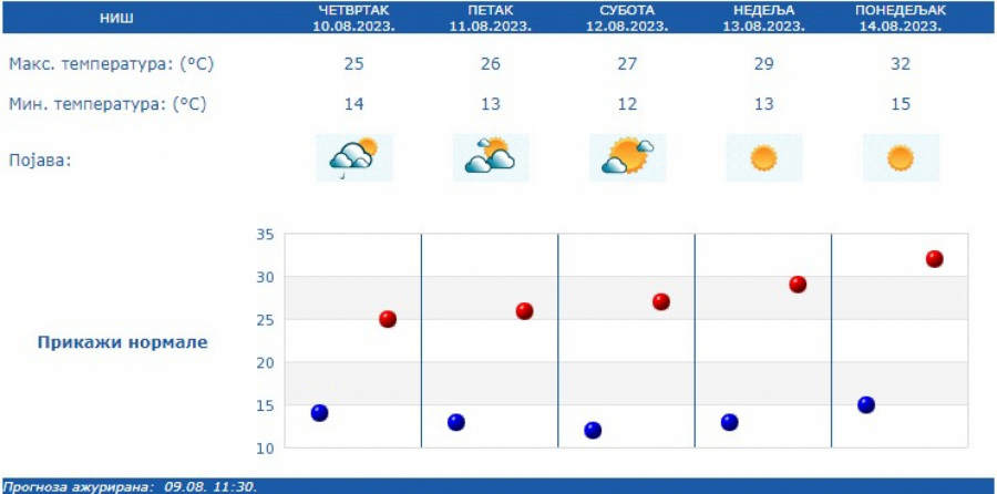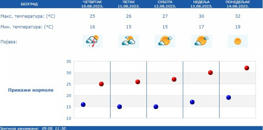 Prema prognozi za narednih nedelju dana, u Srbiji će vreme biti pretežno sunčano, samo u petak u brdsko-planinskim predelima, uz promenljivu oblačnost, kada se tek ponegde očekuje kratkotrajna kiša ili lokalni pljusak sa grmljavinom.