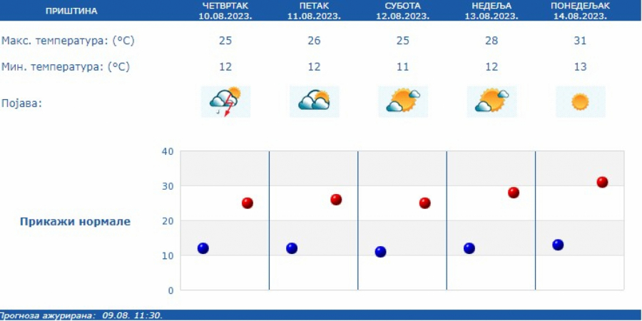 Vetar slab do umeren, severni i severozapadni sa najnižom temperaturom od 11 do 16 °C, najviša od 23 do 27 °C, saopštio je Republički hidrometeorološki zavod.