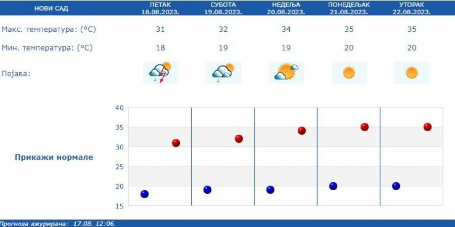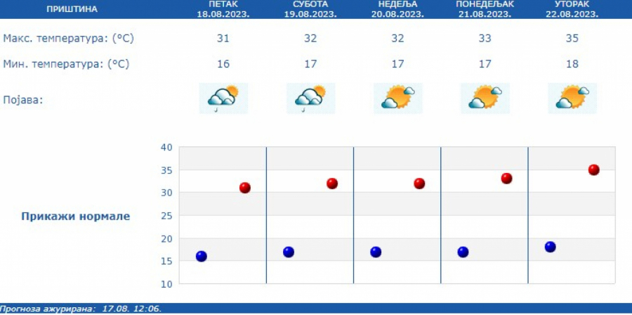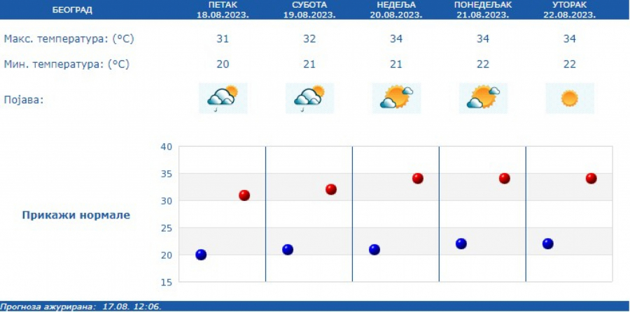 Od nedelje pretežno sunčano i toplo u svim krajevima, dnevna temperatura će biti u porastu, lokalno i do 35 stepeni, a samo je u planinskim predelima, uz izolovani razvoj oblačnosti, moguć kratkotrajni pljusak.
