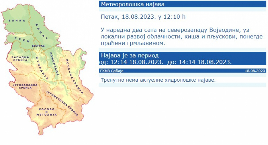 RHMZ je u naredna dva sata najavio kišu i pljuskove na severozapadu Vojvodine, uz lokalni razvoj oblačnosti, kiše, pljuskove, ponegde praćene grmljavinom.