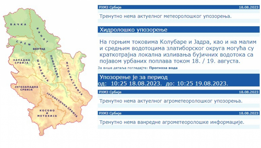 Republički hidrometeorloški zavod upozorio je da je danas i sutra moguće kratkotrajno lokalno izlivanja bujičnih vodotokova sa pojavom poplava na gornjim tokovima Kolubare i Jadra, kao i na malim i srednjim vodotocima zlatiborskog okruga.