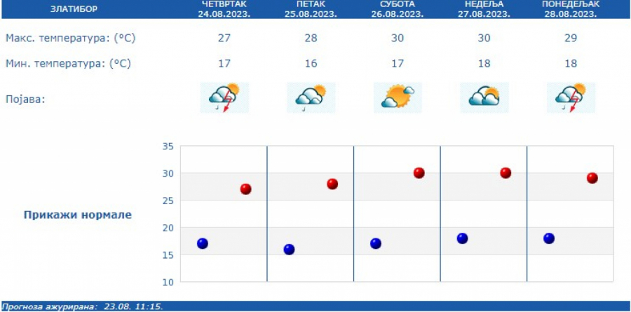 Vreme u Srbiji biće u četvrtak promenljivo oblačno i toplo, u Vojvodini uglavnom suvo, a u ostalim krajevima mestimično sa kišom i lokalnim pljuskovima sa grmljavinom, saopštio je danas Republički hidro-meteorološki zavod.