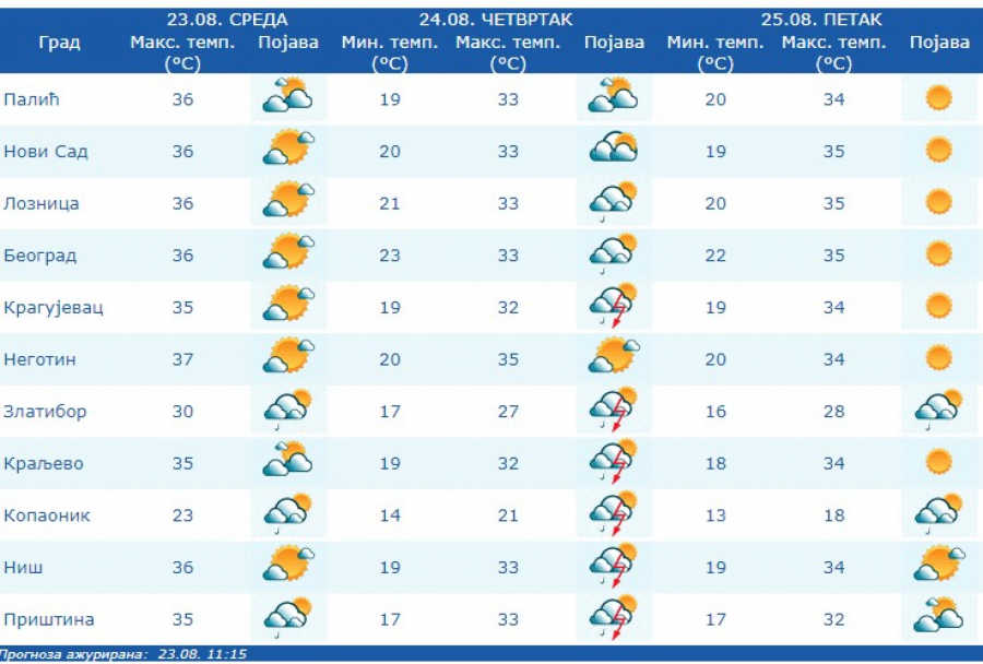 Do ponedeljka biće pretežno sunčano i veoma toplo sa najvišom temperaturom od 34 do 37 stepeni, a u planinskim predelima se, uz lokalni razvoj oblačnosti, očekuje retka pojava kratkotrajne kiše ili pljuska s grmljavinom.