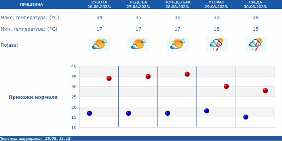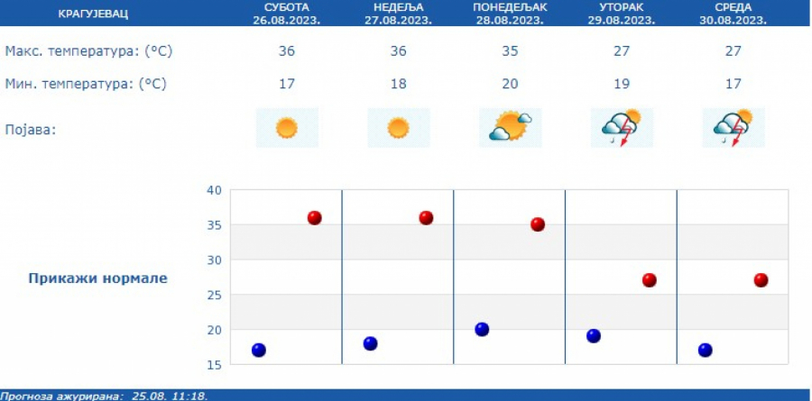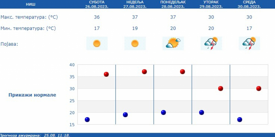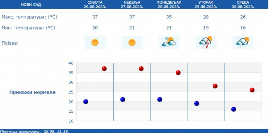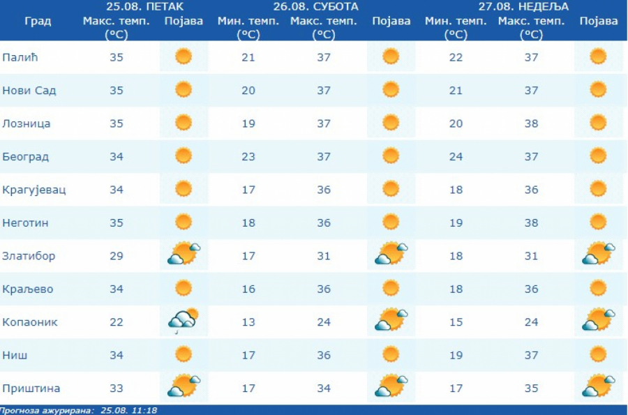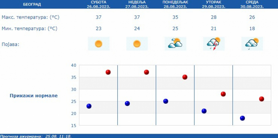 Do ponedeljka (28. avgusta) zadržaće se veoma toplo vreme sa najvišom temperaturom od 33 do 38 °C, stoji u upozorenju na sajtu RHMZ.